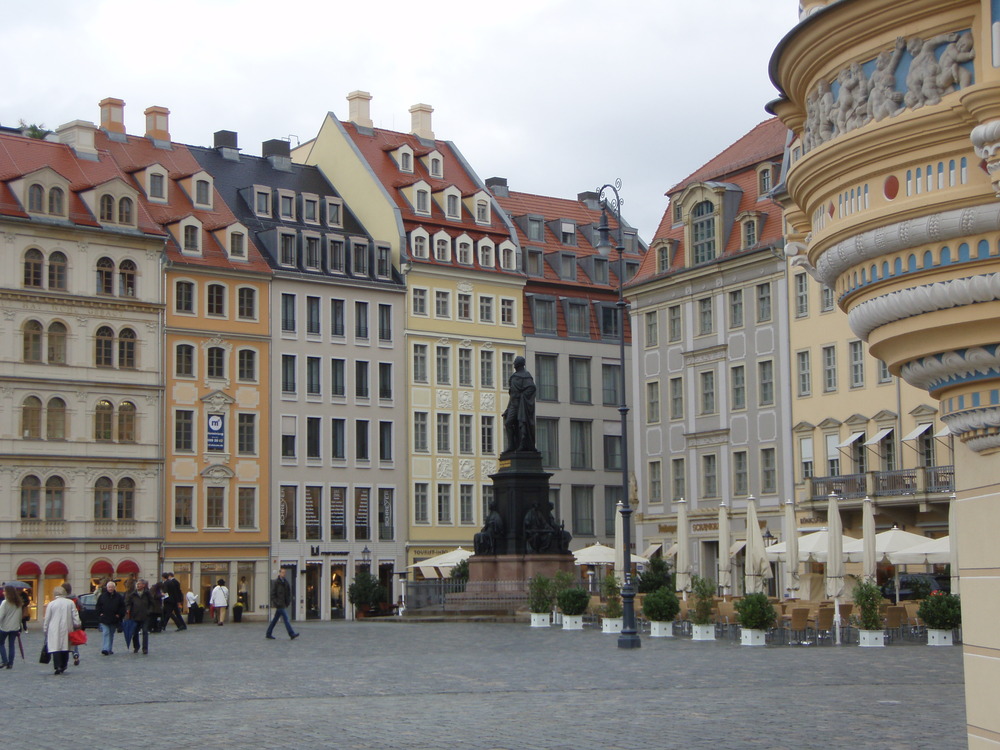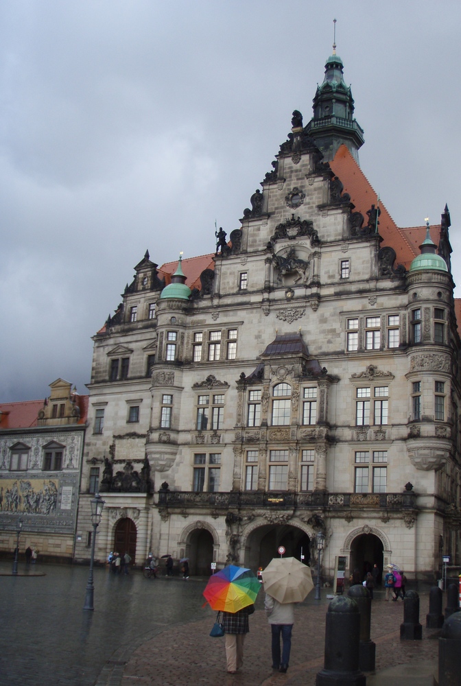 The motto for today was ” Get me out of the Rain!” Cold, wet, windy, nasty, chill to the bone day. Good museum day. Saw Dresden’s 1700’s Treasury Collection – lots of priceless “stuff”, including, my favorites: gems and gem-decorated stuff – to put it simply. I started to count how many diamonds were in the collection and finally gave up when the count was in the hundreds. The star of the show was the 41 karat green diamond (pear shaped) which was mounted with 411 other “smaller” diamonds. Yes, it was beautiful. Tacky? Not in the least! Would it go with anything I have to wear? No , but I could go shopping. : ) Then I walked down a few of the streets known for the ugly buildings that were built by the communists -blocky, plain, drab, and stumbled upon a shopping mall ! It was dry and warm and I had a great sandwich -salami, pickle and butter on some kind of funny bread. It still amazes me – people have their dogs with them everywhere – even in the mall. And 98% of those dogs had on rain coats. St. Louis dogs are under dressed. Tomorrow morning I am off to Berlin.