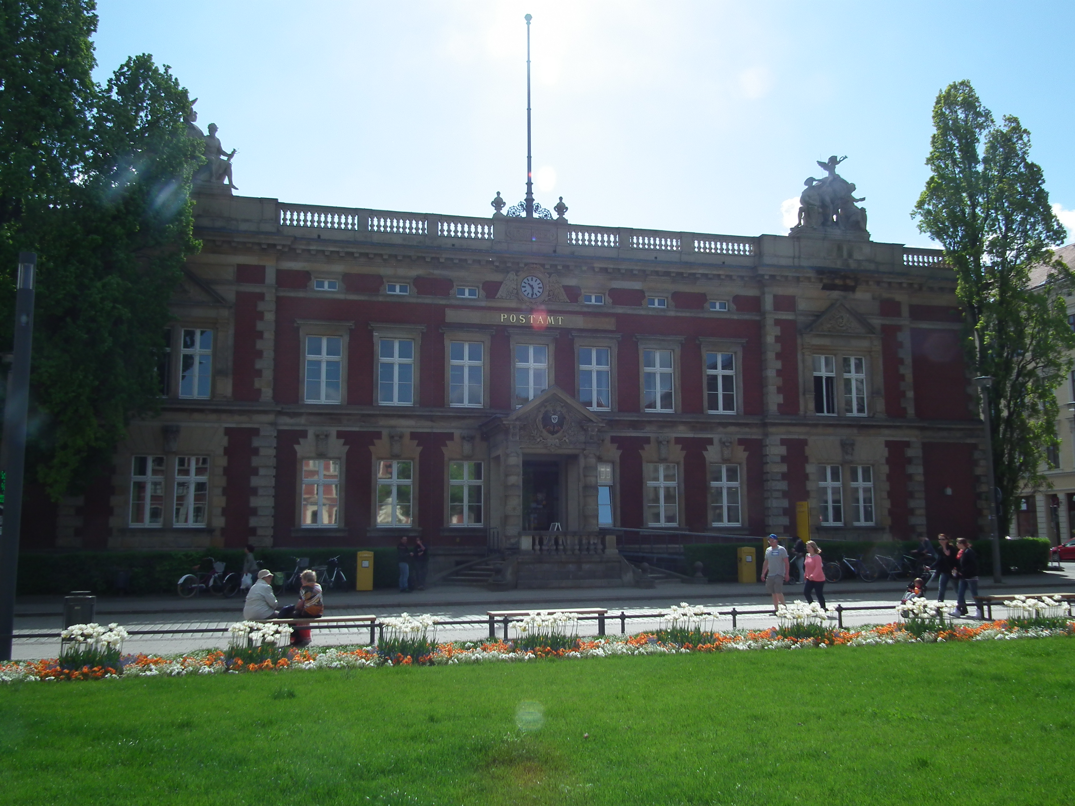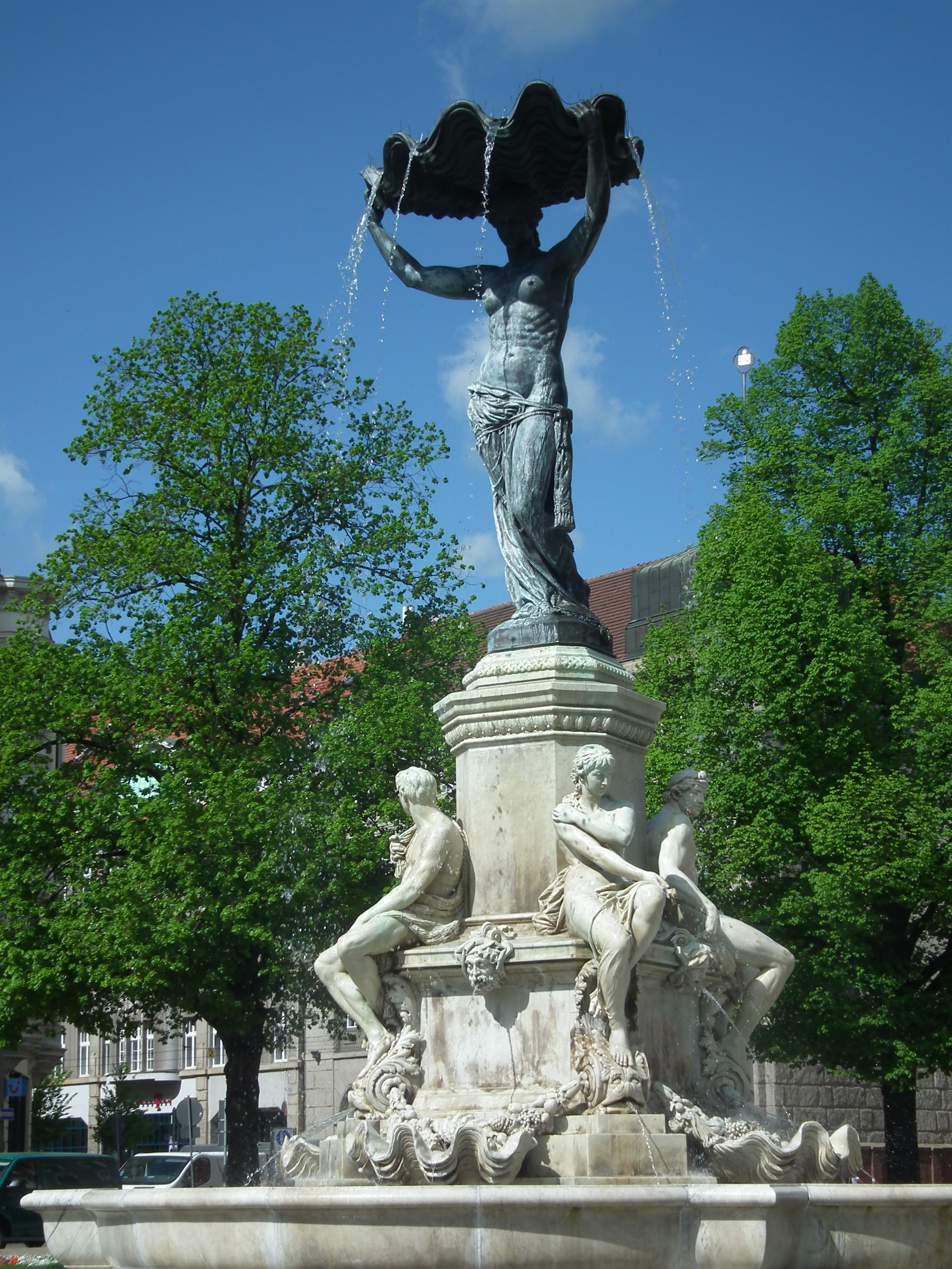 So as I am strolling about Gorlitz, I happen upon the beautiful Postplatz, named so because of the Post Office that lined one side of the square. What first caught my eye were the beautiful spring flowers that lined the whole perimeter of the square. Second was the huge fountain in the middle because – you guessed it- the lady is holding a sea shell above her head.