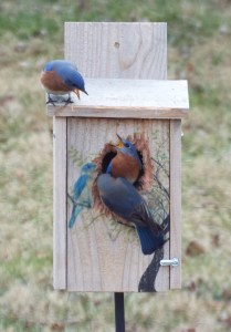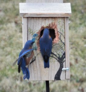 Eastern blue birds are a grand prize of any backyard bird-feeding frenzy and aviary homes! So put out the word that I would gladly buy any special request foods ( meal worms), provide shelter and protection (from squirrels, raccoons and snakes) plus happily monitor their broods if they would choose my backyard BB nest box. I have had a BB nest box up for 5 years but it has only been this past year that I have had blue birds visit and show some interest. A couple weekends ago these 2 males and 1 female blue bird came to check out my newly purchased and mounted BB box. It was move in ready until a squirrel decided to chew the entrance larger. I was slow to made repairs and it may have cost me new residents that didn’t want a fixer upper. After the blue birds left, a new door was quickly installed with the appropriate hole size of 1 and 1/2 inches and a metal hole guard was installed around the hole to discourage any future ” chewers”. I will never hang a nest box again with a hole guard.