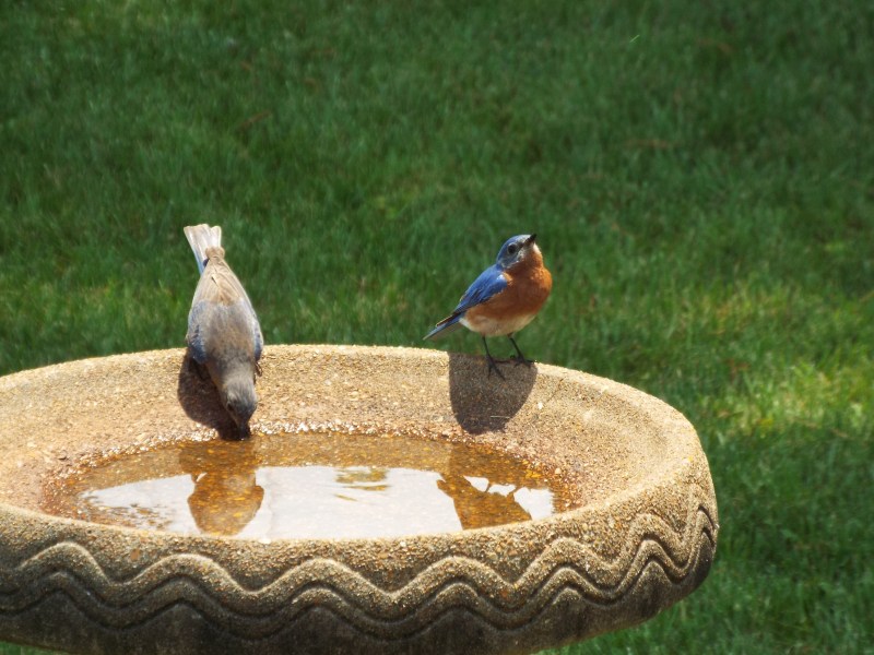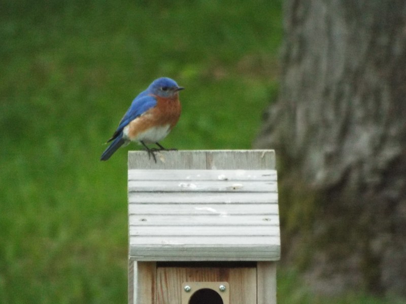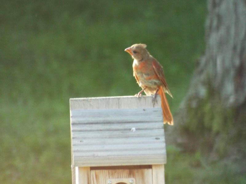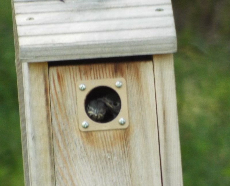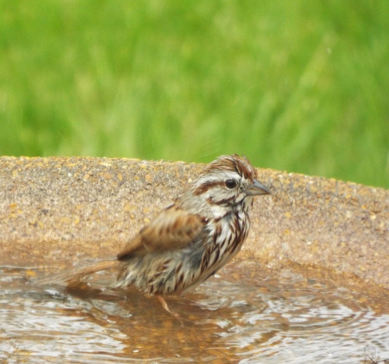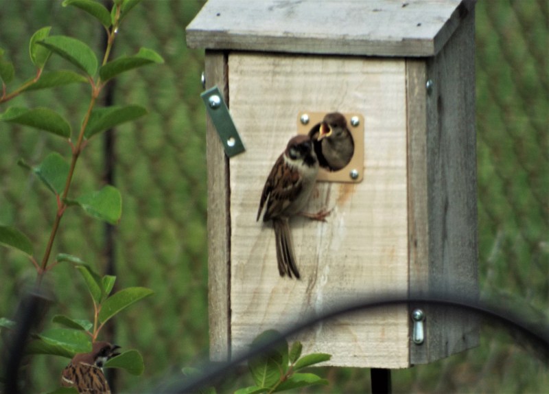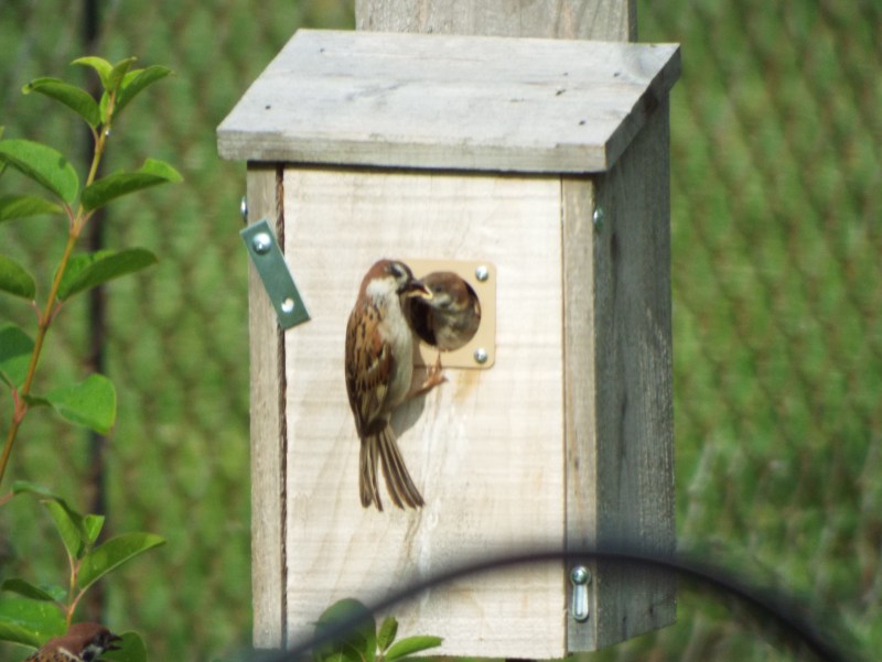 You gotta love the feeding frenzy of mother birds feeding their demanding, ever hungry babies. These Eurasian sparrows are decedents of their ancestors that were brought to St. Louis, Missouri from Germany. Twenty of these birds were released in Lafayette park in south St. Louis in April 1870. Other European birds were also released but only the Eurasian sparrows successfully established a breeding population. They can be found in some areas of St. Louis, along the Illinois River in parts of Illinois and along the Mississippi River to southern Iowa. I have been lucky enough to have a handful of Eurasian Sparrows in my back yard, in south St Louis county, for the last 8 years. Year after year, they regularly raise their many families in my bluebird nest boxes, come to my feeders and drink from my bird bath. Just a reminder – you can always click on an individual photo for an enlargement. (You may have noticed the extra brace on the nest box door – these birds will literally stuff that box with so much nesting material that the door will bulge open.!! Also, sorry for the annoying shepherds hook in every photo – poor placement on my part)