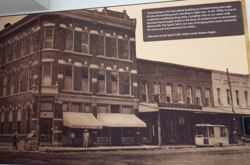 The Terry Block Building in 1950 was occupied by a traditional drug store and it’s ice cream soda fountain on the Bentonville town square. In this same building, on May 9, 1950, Sam Walton opened up his original Walton 5-10 store – the forerunner of Wal-Mart Inc . This location is now the Walmart Museum. Visitors will find the 5-10 store complete with the original floor tiles, tin ceilings, an exhibit/artifacts gallery, “The Spark Cafe Soda Fountain” and many interesting tidbits about Sam Walton’s life and the start up days of Waltons 5-10 / Walmart. The Soda Fountain sells Yarnells ice cream, which is the first ice cream that Sam sold.