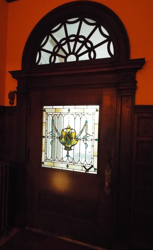 Rockcliffe Mansion today – it needs a paint job but the house was built like a fortress. This house sits behind Rockcliffe. It was moved so that Rockcliffe could be built on its original spot..Beautiful harp in the Music RoomEach room has its own thermostatic heat controlTiffany Stained Glass in the front door.kitchenTiffany stained glass at the top of the grand staircase landingTiffany lampFainting Room – these were needed due to the tight corsets’ the women wore. Painting of Rockcliffe in its finer days. The brick walls lead to the carriage house