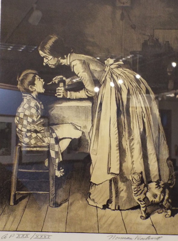 My last Hannibal post is the Mark Twain Museum Gallery – most probably my favorite because it gave me the chance to step into the pages of Twain’s most famous books. With a little imagination, I could ride a raft with Huck and Jim, explore a cave with Tom & Becky, and paint the famous whitewashed fence. Also, the Museum Gallery features 15 original Norman Rockwell paintings, as well as a wealth of artifacts from Twain’s life. In 1935 Norman Rockwell was chosen to create the illustrations in the special editions of The Adventures of Tom Sawyer and the Adventures of Huck Finn. Some of these illustrations are in my photos above along with their captions. The original paintings were given to the museum before Rockwell died in 1978. Remember…….